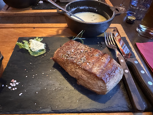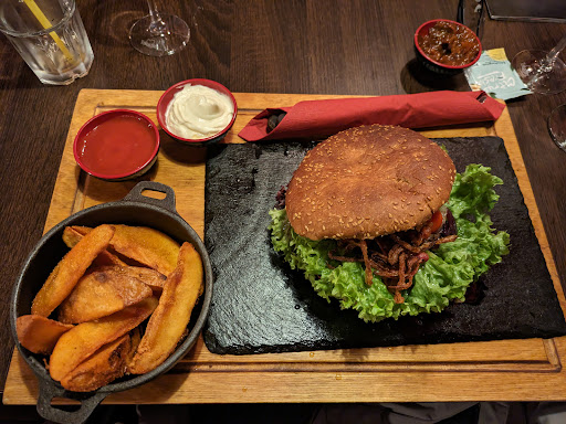 The food was really delicious. I had the white BBQ burger, which I can highly recommend, and my husband had the t-bone. They were out of a few of the meats or only had very large cuts (you pay by weight, plus it was just way more than one person would normally want, like 750g of meat). We got a couple starters, which were delicious, but we probably didn't need them with the main meal being a decent portion. The potato wedges were much better than the fries, which were a...