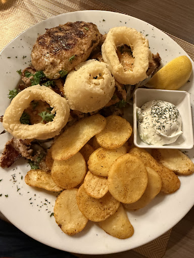 Read moreSalat frisch, Dressing lecker. Üppige Portion, für mich etwas zu viel. Die Kalamaris waren sehr zart, das Bifteki (Frikadelle) sehr fluffig und lecker, Gyros war halt Gyros, nur der Fleischspieß war ein wenig trocken. Ich war auch schon bei anderen Griechen, da war es trotz Filet saftiger. Als halber Grieche verstehe ich eh nicht warum man nicht wie in Griechenland Schweinehals benutzt. Ob TK Pommes angemessen sind überlasse ich jedem selber. Tzatziki könnte ruhig mehr sein, dafür gab es aber einen...