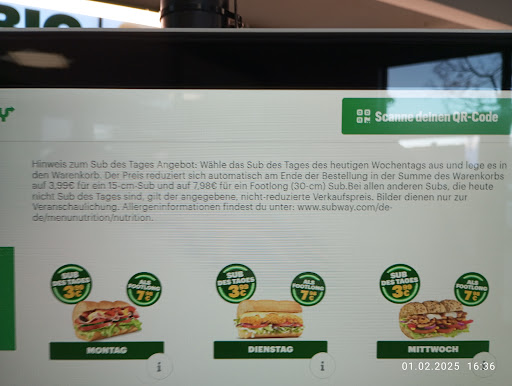 Read moreNicht empfehlenswert! Sub des Tages wurde zum Normalpreis abgerechnet, obwohl am Automaten explizit - siehe Foto - ausgewiesen ist, dass am Ende der Bestellung diese zum Abzug kommt. Auf Rückfragen beim Personal wurde "pampig" geantwortet und sie wären nicht Chef. Man hätte direkt an der Kasse zahlen sollen, dann hätte man mit rechnen können. Außerdem weiß man dort nicht, wie die Terminals funktionieren und kann daher auch keine Hilfe erwarten. Dann braucht man keine Terminals. Außerdem werden auf dem Beleg die Positionen preislich nicht ausgewiesen. Der Salat - nicht mal für die Tierfütterung geeignet, weil verfault. Eine tägliche Kontrolle der frischen Lebensmittel schadet nicht. Und- zum Salat einfach so ein Brot zu bekommen, geht auch nicht, weil :" wir haben kein Brot!" Wenn Subway sich auf subs spezialisiert hat, darf es keine Salate anbieten, die nicht so kommen, wie bestellt. Mein Salat, ohne Salz bestellt, war versalzen.