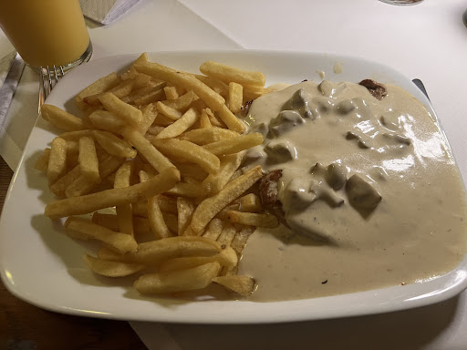 Auch der Hauptgang konnte das Versprechens aus der Speisekarte nicht halten, dass "alle Speisen frisch zubereitet werden". Das Rumpsteak mit Zwiebeln war zwar auf den Punkt (Medium) getroffen und von guter Qualität und auch das Tessiner Schnitzel hatte einen guten Geschmack. Bei den Soßen waren wir uns aber nicht ganz sicher, ob diese aus der Tüte stammten oder selbst zubereitet wurden, zumal deren offensichtliche Nachjustierung mit einem Schluck Wein nicht sonderlich gut gelungen war (Rumpsteak mit Rotweinsoße ist nicht so mein Fall..).