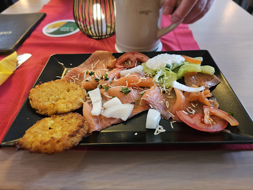 Nice looking place and friendly staff. I think the “boss” got a bit cheeky with us. We asked if he could do a cheese & ham sandwich -“yes, no problem”. What arrived was plain, white sliced bread with very small amounts of plain cheese and ham. Very disappointed. The real shocker was the cost @ €7 each. My own fault, I should have asked how much? The boss remained adamant that food prices are high and costs...