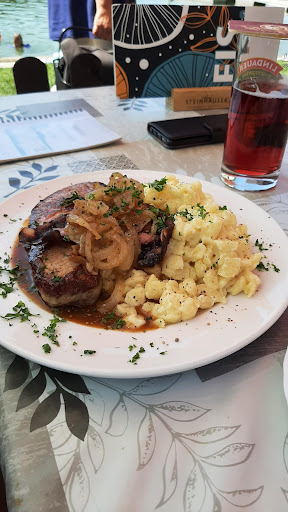 God dammit, how can it be that difficult to find a spot to eat something and not being ripped off by all those touristic restaurants with great view on the lake and bad service. This spot is actually pretty nice. I must start with the service aspect here, the guy was so nice although he had to take care of so many tables. No clue how he managed that and even more stayed calm and friendly. Huge respect. We had to cue to enter this place, all tables were taken but it wasn't too long. The food was okay, not sure if everything was fresh my best guest was it's been from freezer anyway, the location is a blast. You can enjoy a beer, a coffee or simply eat something and have a great view on a small like. If you want you even can jump in. You have to pay for the parking lot but receiver a voucher if you eat in...
