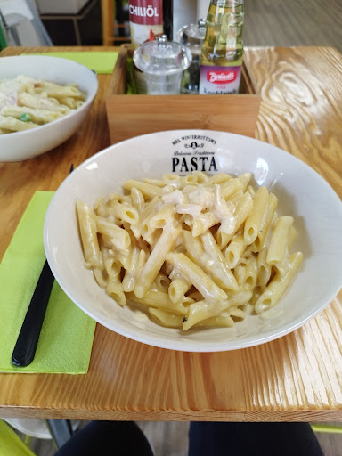 Read moreEin etwas unscheinbarer Laden, aber vom Konzept und dem Essen her hat er mich komplett überzeugt. Als ich und meine Arbeitskollegen dort unsere Bestellung aufgaben. Man bestellt über einen Bildschirm/Tablet sein Essen und kann so auch in aller Ruhe sein Essen genau auswählen und seinen Wünschen entsprechend anpassen. Anschließend gibt man seinen Zettel den Mitarbeitern und sie bereiten das Essen, einem direkt vor der Nase, frisch zu. Auch hier wird noch einmal gefragt wie man das Gericht denn gewürzt haben will. Ich hatte den ,,weißen Traum" als Menü mit kleinem Salat und Getränk für 11€, was meiner Meinung nach ein sehr angemessener Preis ist. Geschmacklich war die Pasta wirklich top lediglich der Salat war etwas ,, langweilig" da außer Salt nur 2 kleine Cocktailtomaten dabei waren. Geschmeckt hat er trotzdem. Man kann zwar auch vor Ort essen, jedoch ist das Konzept eher auf das Mitnehmen von Essen ausgelegt. Dies sollte man in bestimmten...