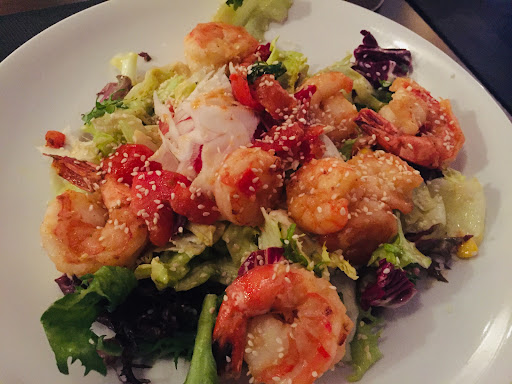 Die Speisekarte ist von der mediterranen Küche stark beeinflusst aber auch Irreführend da es ein mix von vielen kulinarischen Regionen ist und man somit keinen Anhaltspunkt bekommt. Wir hatten zum Essen Surf'n'Turf und Dorade. Das Steak wurde Medium-Raw bestellt und kam medium und das Surf vom Turf ist wahrscheinlich wieder ins Meer gesprungen, denn von den Schrimps (2Stück) war auf dem Teller nicht viel zu sehen. Die Soße zu dem Steak schmeckt genauso gut wie Wasser. Die Dorade war sehr gut portioniert und geschmacklich auch sehr lecker, optional ein paar Zitroneneschlitze hätten den Teller sehr gut ergänzt. Zu den Speisen gehörten noch ein Beilagesalat, Wok Gemüse und Offenkartoffel oder Pommer dazu. Der Beilagesalat war sehr frisch leider hat die industrielle Honig-Senfsoße die drüber geleert wird, den ganzen Geschmack und auch die Qualität runtergezogen. Das Wok Gemüse war an sich ganz gut dafür, dass es am morgen vorbereitet und zu jedem Teller mal kurz in die Mikrowelle gesteckt wird und dann mit ein wenig Sesam aufgepeppt. Die TK Pommes waren etwas hart und sehr sehr trocken, da hat auch die "Bratsoße" nicht mehr geholfen. Die Ofenkartoffeln waren wiederum sehr lecker und gut gewürzt.