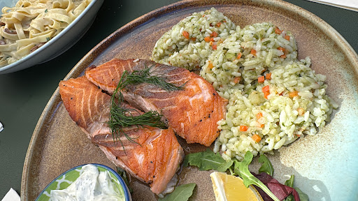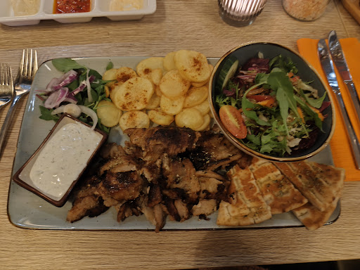 Essen an sich war lecker. Nicht Öl-Durchtränkt und die Kartoffelchips knackig. Zaziki und Fleisch am Spieß könnte mehr sein. Aber gut. Nicht gut: wir hatten nur 1 Getränk, weil keiner mehr kam und gefragt hat, ob wir noch was möchten, obwohl die Getränke zum Hauptgang leer waren.