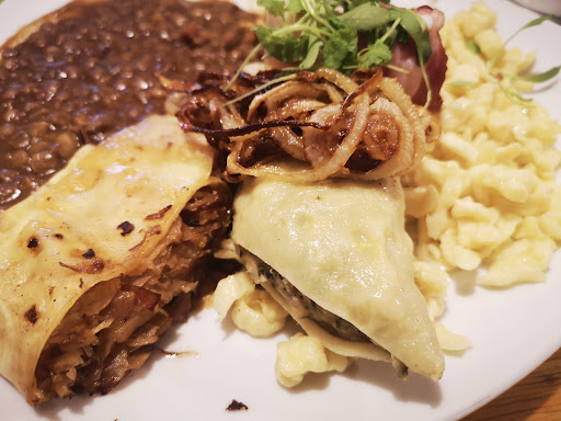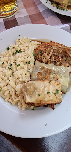 Das Gericht bestand aus einem perfekt gegrillten Schweinerückensteak, garniert mit knusprigen Röstzwiebeln, einer herzhaften Maultasche, einem schmackhaften Krautwickel und cremigen Käsespätzle. Die Portion war großzügig bemessen und für uns genau richtig. Besonders das saftige Schweinesteak hat uns begeistert – es war auf den Punkt zubereitet, zart und aromatisch. Auch die Maultasche verdient eine besondere Erwähnung: Sie war die beste, die ich je gegessen habe, perfekt gewürzt und mit einer wunderbaren Textur.