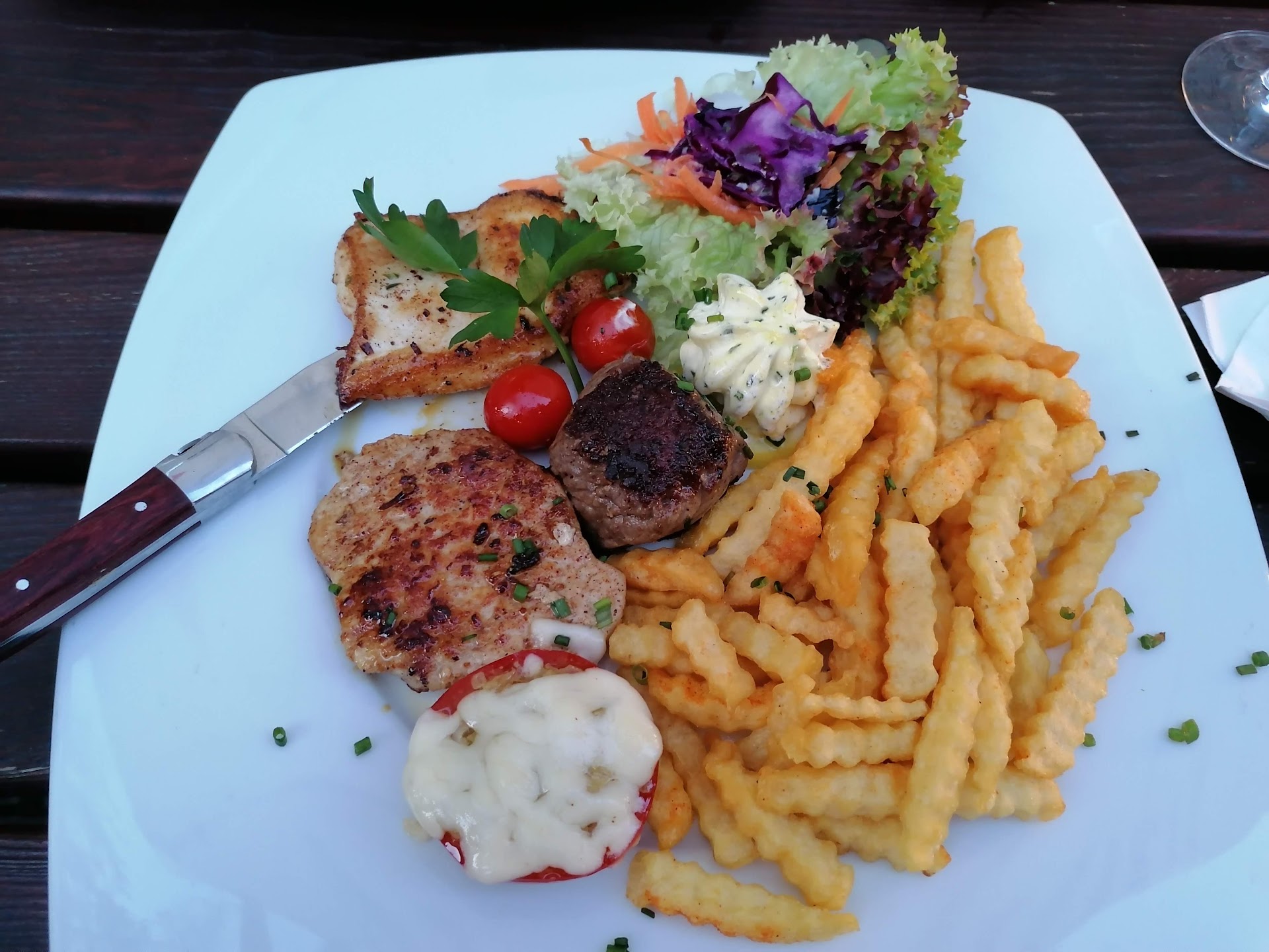 Gesamt: Essen = 4 Sterne (war gut) Ambiente = 3 Sterne (draußen okay) Service = 3 Sterne (guter Service, wurde aber getrübt von oben besprochenen Dingen)