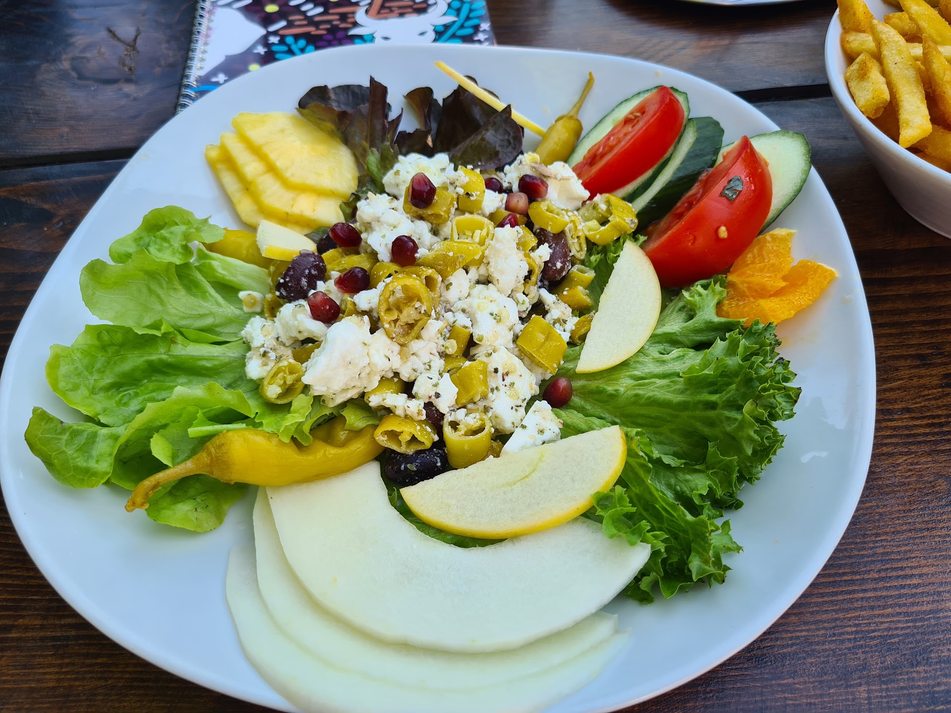 Als der Salat kam, war ich doch extrem überrascht. Auf den Bildern sieht es nicht so schlecht aus, war aber meines Erachtens echt nicht ok. Der "Salat" bestand aus zwei Salatblättern und zwei Gurken- und Tomatenschnitzen und ein bisschen Obst. Schafskäsegemisch in der Mitte bestand aus Schafskäse, Granatapfelkernen, Peperoni und Oliven mit Kern. Kein Dressing am Salat und keinerlei Gewürz in dem Gemisch.