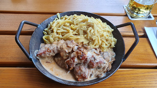 Ich habe mir den Wildtopf mit hausgemachten Spätzle bestellt und meine Liebste hat sich einen Flammkuchen bestellt. Dieser war kross gebacken und sehr gut. Mein wildtopf (quasi ein hirschgulasch) war unglaublich geschmackvoll. Selbst der Vorspeisensalat hat mega gut geschmeckt. Der bestand aus grünem Salat, rotkohl, tomate, gurke, krautsalat und kartoffelsalat alles mit essig und öl angemacht. Simpel aber gut.