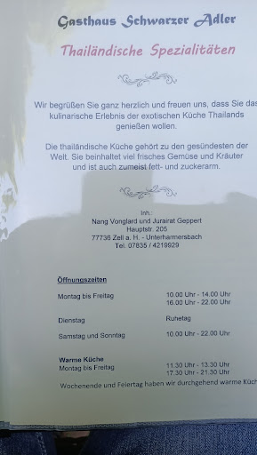 Read more1993 nach einem Brand original wiederaufgebautes prächtiges Fachwerkhaus aus dem 19.Jhdt. mit gemütlichem Schwarzwälder Interieur (Kachelofen, Landhausstil), feine, wohlschmeckende thailändische Küche. Auch etwas deutsche Küche vom Vespertyp. Da man auch "mit den Augen" ißt, könnten die Speisen noch etwas fantasiervoller serviert werden. (Das Hauptgericht ist von mir schon etwas "inszeniert", serviert wurde der runde Teller nur mit dem duftenden Reis und einer Gurkenscheibe.) Highlight: Schwarzwälder Eis mit separat serviertem Kirschwasser! Das Gasthaus verdient es, einem größeren Publikum bekannt gemacht zu werden. Interessant ist, daß man zu jeder thailändischen Spezialität die Fleischsorte (Huhn,Schwein,Rind) separat...