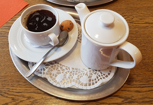 Ein familiengeführtes Café, wie man es aus den guten alten Zeiten kennt (und wie sie leider immer seltener werden). Hier wird Service groß geschrieben, das Personal war durch die Bank äußerst freundlich! Auch an den Produkten gibt es nichts zu meckern, alles sehr lecker. Schön ist. z.B. dass es hier noch Kännchen gibt und das zum Kaffee nicht so ein Standard Caramel-Hartpappen-Keks gelegt wird, wie an der Tanke und in 80% aller Cafés mittlerweile üblich. Hier gab es einen kleinen runden Butterkeks, dem schottischen Shortbread ähnlich. Der vegane Heidelbeerkuchen, den man uns zum probieren gab (und von dem ich mir anschließend natürlich was mitgenommen habe) ist richtig lecker und vor allem nicht so süß. Und: Es gibt hier Sesambrötchen! Ich weiß nicht wieso, aber diese sieht man immer seltener in den Körben der Bäckereien. Die Einrichtung ist ziemlich schlicht - ich z.B. habe irgendwie die für solche Cafés sonst üblichen Schirmlämpchen auf den Tischen oder auf den Fensterbänken vermißt. Aber man kann nicht alles haben ;) Dafür fühlte ich mich preislich wieder ca. zehn Jahre oder mehr in die Vergangenheit versetzt, was aber auch der Tatsache geschuldet sein kann, dass ich im Speckgürtel Stuttgarts wohne, von dem Durmersheim ziemlich weit weg ist. Aber dieses Café sieht mich...