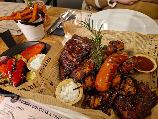Das Restaurant ist eine tolle Bereicherung für Mochenwangen und ich gebe eine klare Empfehlung! Ich war mittlerweile dreimal im Bahnhof 1911, zu unterschiedlichen Zeiten; zweimal mit Kumpels und nach bestandenem Test auch mit meiner Familie :-) Die Bedienung war jedes Mal sehr freundlich und flott, sowohl für die Getränke als auch für das Essen; egal ob viel los war oder wenig. Ich finde es toll, dass die Betreiber ihr eigenes Bier brauen, wenngleich es nicht ganz meinen Geschmack trifft; aber Geschmäcker sind ja verschieden :-) Das Helle ist mir persönlich etwas zu säuerlich; aber das Dunkle ist für mich gut trinkbar. Zu essen hatte ich bislang nur den Bahnhof-Burger (da mir Steaks generell, also nicht nur hier sondern auch andernorts, etwas zu teuer sind und dann das Risiko dass es nicht schmeckt zu hoch). Also der Burger ist wirklich genial und besser als in RV (QMUh und Riggs). Das Fleisch hat einen hammer Grill-Geschmack und ein gutes Gewicht und der Burger ist lecker und optisch klasse belegt. Zusammen mit einer Beilage und einem Dip ist er mit 15,50 EUR zwar etwas teurer als in genannten RV-Burgerrestaurants, aber dafür auch mindestens ein, zwei Nummern besser. Etwas ausbaufähig finde ich als Familienvater noch die Auswahl für die Kids (bislang nur Chicken Nuggets und Wings, jeweils mit Pommes und Sauce); aber positiv ist dass beide Kinder-Gerichte unter 6 EUR kommen (was man heutzutage nicht mehr häufig findet) und in großer Position. Von daher ist das nur eine kleine Anmerkung. Zuletzt noch das Ambiente: wirklich 1A! Da hat sich das Warten auf die Einrichtung (und die damit einhergehende verspätete Eröffnung) wirklich gelohnt. Modern und doch gemütlich auf das historische Gebäude abgestimmt; nicht zu hell und nicht zu dunkel und für eine kleine Ortschaft wie Mochenwangen sicherlich eine Überraschung. Da die großen Fernsehbildschirme hier ausschließlich stimmungsvolles Kamin-Feuer zeigen, stören sie nicht wie anderen Lokalen wo man durch Fußball- oder Musik-Übertragung vom Essen und der Unterhaltung abgelenkt wird, sondern tragen zur gemütlichen Atmosphäre bei. Toll für unsere Jungs war es auch, dass sie vom Tisch die vorbeirauschenden Züge beobachten konnten. Man hört drinnen quasi nichts von den Zügen und so kann man in wunderschönem Ambiente in alter Bahnhofsromantik schwelgen.