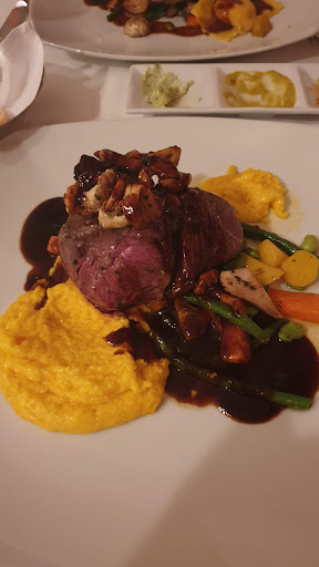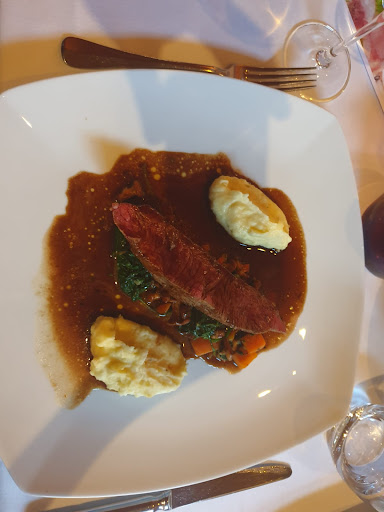 Vorweg, das Essen war sehr lecker. Das Ambiente ist schön und man kann hier einen schönen Abend verbringen. Was für uns beim betreten des Restaurants aufgefallen ist war beim ersten begrüßen mit der blonden Bedienung, die einem musternd nach unten anschaut. Es tat dem Abend zwar keinen Abbruch aber sehr willkommen empfanden wir das nicht. Kurz zusammengefasst, die Art der blonden Bedienungen wirkte herablassend. Eine dritte Mitarbeiterin ( nicht blond ) die bei uns am Tisch war, war sehr angenehm, freundlich und zuvorkommend. Das Essen ( Rumpsteak) war sehr sehr gut, großes Lob an den Koch! Für das Gericht "Geschnetzeltes" mit 50 Gramm Nudeln, 32 Euro zu verlangen ist für mich absolut überteuert, wenn im Vergleich ein Rumpsteak mit Beilagen 34 Euro kostet. Meine Meinung! Kann jeder selbst entscheiden. Ist natürlich bezahlbar, steht für mich nur nicht im Preis- Leistungsverhältnis. Zusammengefasst schmeckt das Essen sehr gut, daran ist nichts auszusetzen. Was nicht angenehm ist, ist der Umgang der beiden blonden Mitarbeiterinnen, die meinen man sieht die ein und andere Geste nicht, die sie sich zuwerfen...