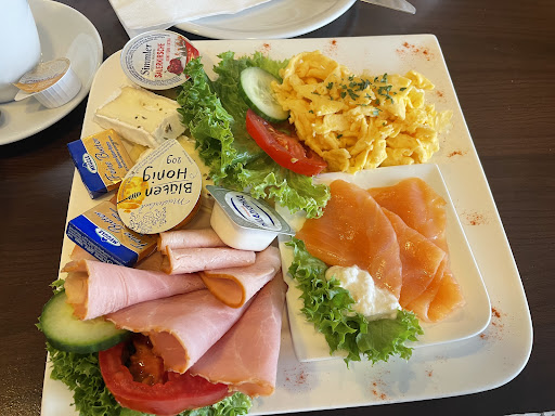 Read moreHier bekommt man was geboten für sein Geld. Waren zu zweit dort und hatten zweimal das Schlemmer-Frühstück, welches mehr als reichhaltig war. Es war schön angerichtet, frisch und lecker. Die Mitarbeiterinnen waren sehr freundlich. Die Einrichtung ist allgemein eher dunkel gestaltet und auch nicht allzu hell beleuchtet. Es gibt jedoch auch die Möglichkeit am Fenster zu sitzen, weswegen das nicht allzu sehr ins Gewicht fällt.