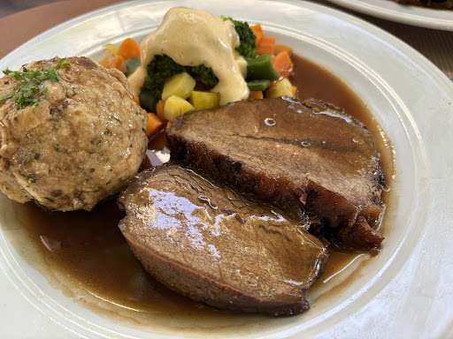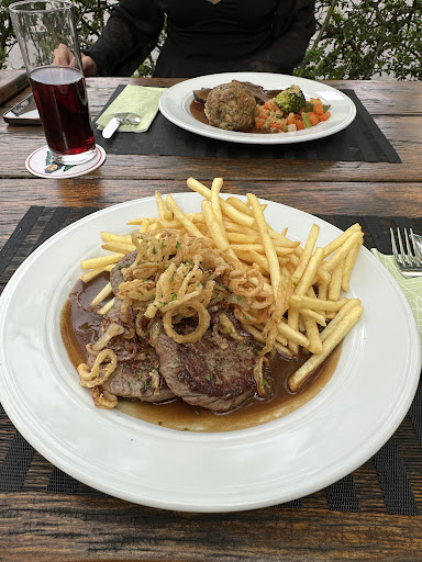 Das Essen schmeckt sehr gut; wir hatten Rindsleber sowie das Argentinische Hüftsteak aus der Tageskarte. Zur Vorspeise einen gemischten Beilagensalat, der schon sehr groß war sowie eine Flädlesuppe. Zum Dessert einen Apfelstrudel, Schwarzwaldbecher und marinierte Erdbeeren.