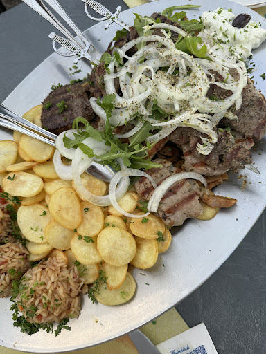 Read moreWir waren auf Grund der guten Rezession Essen und müssen zugeben, wir können die positiven Bewertungen hier nicht so weiter geben. Der Service war zuvorkommend und freundlich. Das Essen, ein kleiner gemischter Salat war recht unlieb hergerichtet und mit viel Soße überträgt. Geschmacklich kein Highlight. Die Grillplatte mit Suvlaki, Gyros, Rindersteak und Lamm Spieße und den üblichen Beilagen wie, Kartoffelscheiben und Tomaten- Reis sowie etwas Zaziki überzeugten uns nicht! Die Lamm-Spieße sowie das Suvlaki waren gut, jedoch das Gyros war sehr versalzen sowie sehr durchwachsen, zäh und das Rindfleisch war ungenießbar, trocken und zäh. Ein sehr kleiner Klecks Zaziki säumte den Rand der Platte, etwas wenig für die angegebene Personenzahl. Das Ambiente ist schön, im Garten lässt es sich schön sitzen, der Innenraum wirkte etwas ungepflegt, schmutzige Scheiben, dreckiger Teppich im Eingangsbereich. Das Damen WC war sauber, die Armaturen der Waschbecken waren beide defekt ( eines ging garnicht,lief kein Wasser, die andere Armatur lief zwar aber wackelte sehr ) Kennen andere Griechische Restaurants in der Umgebung deren Preis-Leistung sicherlich...