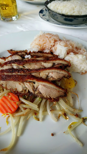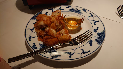 Read moreDas Essen hier war überwiegend gut. Die Frühlingsrolle war TK Ware, sehr knusprig ausgebacken und schmeckte eher neutral. Die Ente, das Huhn, Gemüse, Reis, waren vollkommen in Ordnung. Vor allem die Ente war sehr knusprig und ausgesprochen lecker. Die Portionsgrößen waren in Ordnung, allerdings wird bei mehreren Gästen recht wenig Reis zur Verfügung gestellt. Was allerdings sehr schade war, war der Service. Es dauerte lange recht lange bis allein die bestellten Getränke eintrafen. Das Essen an einem Tisch wurde mit einem Zeitabstand von 10 Minuten gebracht, das heißt, der erste war schon fast fertig mit seinem Essen, der letzte hatte seins noch nichtmal auf dem Tisch stehen. Dazu dann eben eine Schale Reis für alle, somit hatte der letzte doch recht abgekühlten Reis schon. Ich denke, das kann man besser organisieren. Zudem bekommt man sein Getränk, auf ein weiteres muss man lange warten, bzw. auf die Möglichkeit, eins zu bestellen. Hier wurden wir eher ignoriert, als wir nach dem Essen noch etwas trinken wollten. Im großen und ganzen kann man hier ganz ordentlich Essen, Preis/Leistung ok, es ist aber noch Luft nach oben, vor allem beim Service und der Organisation! Und bitte, entfernt die armen Fische. Es ist grausam diesen zuzuschauen wie sie in ihrem Aquarium trostlos...