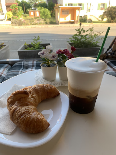 Eintreten und eine nette kleine Bäckerei betreten. Cappuccino war gut. Leider nicht heiß und aber dafür auch nicht zu dünn. Croissants sind gut, der Preis liegt, wenn ich mich recht erinnere, bei 1,80 Euro....