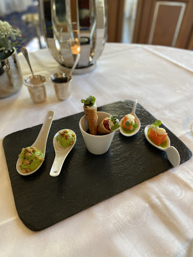 Read moreNous avons beaucoup aimé l'expérience mais il y a des petites choses à revoir. Pour commencer, je tiens à dire que le service est impeccable. La qualité de la nourriture et des vins aussi. Les serveurs très agréables. Nous n'avons pas aimé l'ambiance, qui est beaucoup trop guindée. Difficile de parler sans chuchoter, les gens ne cessent de se regarder et de s'entre juger. Nous n'avons pas été à l'aise sur ce point. La musique est inexistante ou presque. Ensuite la cuisine gastronomique allemande (on m'avait prévenu) n'est pas aussi fine que celle de certains de ses voisins européens. En effet, il y avait des plats qui n'était pas assez recherchés, sophistiqués ou travaillés. C'était très savoureux néanmoins, comme je le disais précédemment, la qualité des ingrédients est au rendez-vous tout de même, mais il manque quelque chose pour un 2 etoiles michelin. Le prix n'est pas non plus démentiel pour un etoilé, ça rattrape de bilan final mais je ne pense pas que j'y...