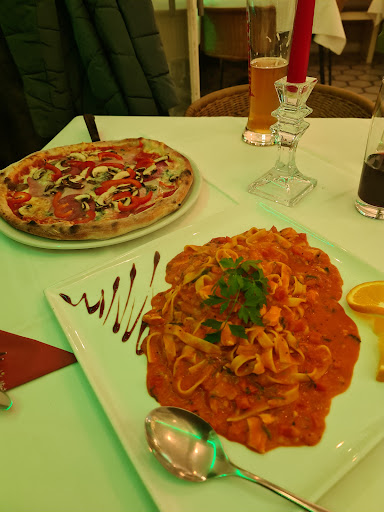 Bei der Heimfahrt Lust auf italienisch bekommen. Leider war es weiter weg von der Autobahn wie gedacht. Wie wir in das Lokal reinkamen, hies es direkt, das wir uns gerne hinsetzen können, aber es wird eine Weile dauern. Eine schöne ruhig liegende Terrasse im Innenhof mit Blick auf einen Brunnen gibt es auch. Mit der Wartezeit war es erträglich, die Essen die aus der Küche herausgebracht wurden, sahen alle sehr Lecker aus und waren auch bei diesem Stress sehr schön angerichtet. Als unsere Essen (Bruschetta/ Pizza (die scharfe Salami hat echt Feuer👍)/ Salat/ Nudeln) kamen, waren wir alle sehr zufrieden. Abstand zwischen Vor- und Hauptspeise hat sehr gut geklappt. Das Aussehen spiegelte den Geschmack wieder, es war alles sehr gut. Beim Bezahlen wurde nochmals Entschuldigt, das es so lange gedauert hat.