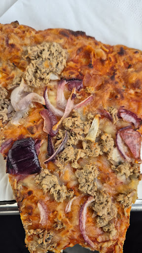 The café offers a wide variety of sandwiches, Bagels and pizza slices, hot and cold beverages and ice cream. Cakes and tarts are also available. Vegan options include the avocado or Falafel bagel and an apple cake. Oat milk is available at no surcharge. Service staff is friendly and efficient.