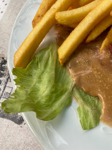 Fleisch war vertretbar ,(wenn auch keine Offenbarung )Soße mit Pilzen ok. Was die 20 Pommes und das in der Soße versenkte Salatblatt sein sollten (sollte wohl Garnitur sein) lasse ich offen.
