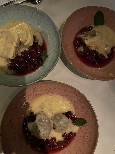 Wir haben das Menü ohne Zwischengang (vier Gänge für 73 €) bestellt. Als Vorspeise hatten wir ein Puri-Bällchen, das mit Guacamole gefüllt war. Hier war im Grunde einer der größten Kritikpunkte: Es gab ein kleines Bällchen; wir dachten erst, es sei ein Amuse- Gueule. Geschmacklich herausragend, von der Größe her aber wirklich viel zu wenig. Der zweite Gang war eigentlich ein Pfifferling-Salat. Ein Teil unserer Gäste ersetzte diesen Gang mit "Tabla". Grundsätzlich fiel dieser Salat im Vergleich zu allen vier Gängen vom Niveau doch deutlich ab, obwohl er immer noch gut geschmeckt hat. Mit Blick auf die Preisgestaltung und im Vergleich zum Niveau der anderen Gänge sollte man sich überlegen, den Salatgang etwas „aufzupeppen“. Die Ente als Hauptgang war herausragend, ein anderer Teil der Gäste nahm den Atlantikfisch, der ebenso exzellent war. Highlight des Menüs waren die kunstvoll angerichteten und einfallsreichen Desserts. Einzig die kleinen kunstvollen Minitörtchen (unten weiß, oben rot) konnten vom Geschmack her nicht überzeugen, hier mal ggf. noch etwas justieren.