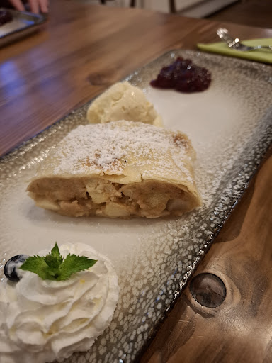 Wir Bestellten Hähnchen Schnitzel mit Bratkartoffeln und Kochkäse, Rumpsteak mit Bratkartoffeln und Zwiebelsosse, und ein Schweinschnitzel. Als erstes Haben wir einen Beilagensalat bestellt. Als Dessert haben wir Bayrisch Creme und ein Apfelstrudel genommen.
