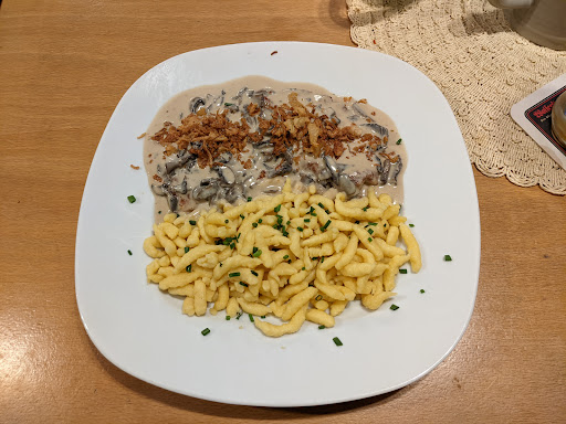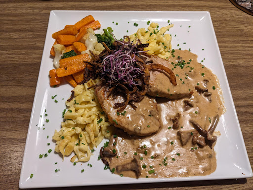 Read moreInsgesamt momentan leider nur unterer Durchschnitt. Ich war heute im Rahmen einer Betriebsfeier dort. Raumtemperatur im großen Saal gefühlte 14 °C und mich hat es trotz 2er (!) Jacken gefroren. OK, das ist in Anbetracht der aktuellen Energiesparsituation noch irgendwie nachzuvollziehen, dass ein Saal mit einer solchen Raumhöhe nicht so stark geheizt werden kann. Man muss sich derzeit einfach im Klaren sein, dass es dort nicht viel wärmer, als in einer katholischen Kirche ist. Was aber dann wirklich Anlass zur Kritik gibt, war das Essen: Mein Schwabenteller war nur noch lauwarm, als er bei mir ankam. Die beiden Scheiben Fleisch lagen lieblos übereinandergestspelt, mit einer relativ geschmackslosen Pilz-Rahmsoße übergossen auf dem Teller. Die dazugehörigen Spätzle daneben waren dann als Krönung mit einer dunklen - geschmacklich überhaupt nicht dazupassenden - Braten-Packerlsoße "verfeinert". Nein, hier ist wirklich noch seeeehr viel...