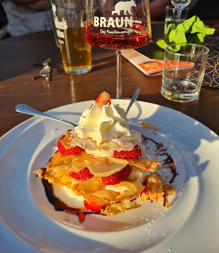 Read moreWir hatten einen sehr schönen Abend im Weingut Braun. Die Speisen (Welsfilet, Schäufele, Cordon bleu) waren köstlich. Die Erdbeer-Lasagne als Dessert war nur eine von etlichen kreativen Nachspeisen. Tatsächlich kann man neben einer außerordentlichen Vielfalt an eigenen Weinen (Gelber Muskateller, Sauvignon Blanc, Rosenmuskateller usw.) auch sehr gute Biere trinken. Alle drei Bedienungen waren zuvorkommend, fürsorglich und herzlich. Ein großes Dankeschön an...