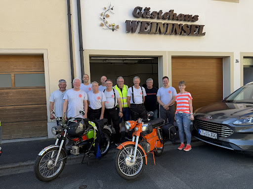 Wir – zehn Männer mit Mopeds der Marken Hercules, Kreidler und Zündapp, begleitet von Silke im Servicewagen – haben im Rahmen einer 4-tägigen Ausfahrt im Gasthaus Weininsel Quartier bezogen. Die frisch renovierten Zimmer sind liebevoll eingerichtet und sehr gepflegt – man fühlt sich sofort wohl. Morgens erwartete uns ein reichhaltiges Frühstücksbuffet mit allem, was das Herz begehrt: Wurst, Käse, Brot, Brötchen, Süßspeisen, Obst – auf Wunsch frisch zubereitete Eierspeisen. Abends speisten wir auf der schönen Terrasse. Die Speisekarte ist vielseitig und überzeugte mit klassischen fränkischen Gerichten (Schäufela, Bratwürstle, Blaue Zipfel, Tafelspitz), Schnitzel-Variationen, Toastgerichten und Salaten. Alles war hervorragend zubereitet und wurde freundlich serviert. Ein besonderes Highlight war die Hilfe des Inhabers Andreas Glaser, als ein Moped am ersten Tag einen Totalschaden hatte. Er organisierte für uns spontan einen Anhänger, fuhr persönlich 50 km, um ihn zu holen – und ermöglichte so, dass unser Kollege weiter an der Tour teilnehmen konnte. Ein außergewöhnlicher Einsatz, den wir so noch nie erlebt haben! Ein großes Dankeschön auch an das gesamte Team des Hauses: ob Zimmerservice, Servicekräfte oder Küche – alle waren stets freundlich, hilfsbereit und engagiert.
