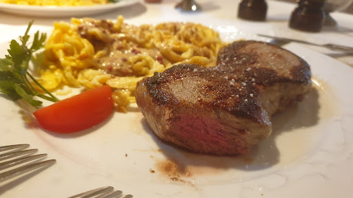 Read moreWir hatten reserviert und auch einen Tisch für 2 bekommen. Man kann direkt vor dem Restaurant parken - sehr gut. Das Ambiente haut einem sicherlich nicht um. Der erste Eindruck ist irritierend. eigentlich sieht das nicht wie ein Restaurant aus, es hat eher etwas Kellerclubambiente. Gefliester Boden, Kellerfenster zur Bahnseite die von außen vergittert sind und insgesamt eher 80er-Jahre Einrichtung. Sehr nett der Empfang und die Tischzuweisung. Das Mobiliar und die Gesamteinrichtung lässt keinerlei gemütliche Atmosphäre zu. Die Bemühungen mit der Tischdeko (Weinblätter und Kerzen...) verpuffen im kalten Gesamteindruck. Die Auswahl an Steaks und weiteren Essen wird durch eine Saisonale Karte ergänzt und lässt sicher jeden etwas passendes finden. Die Weinempfehlung war perfekt. Meine Frau hat sich für das Kalbsschnitzel überbacken und ich mich für das Filetsteak entschieden. Zu den bestellbaren Extras gibt es einen schmackhaften Salat sowieso dazu - sehr lecker. Das Essen war lecker aber nicht überragend. Der aufgerufene Preis für das Kalbschnitzel war ok, das Filetsteak habe ich für diesen Preis schon deutlich besser gegessen. In Summe haben wir für 65 Euro gut gegessen und getrunken aber eben nicht so gut, dass wir hier nochmals herkommen müssten.... Der Wohlfühlfaktor war...