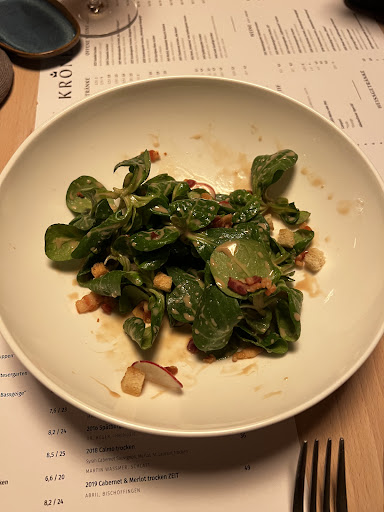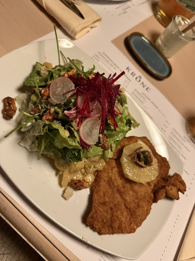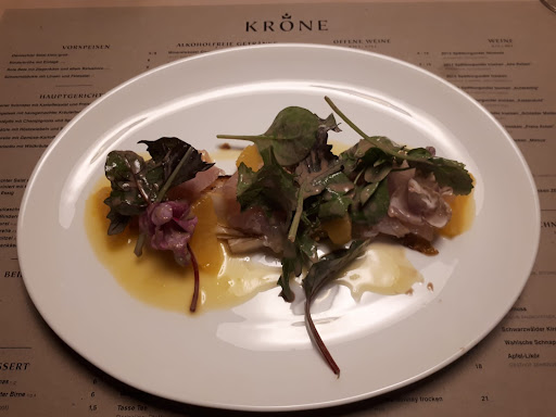 Read moreWir waren an einem Freitag Abend in der Krone Essen. Der selbst gemachte Apfelsaft als Schorle war prima. Hatte aber auch nen ordentlich nicht günstigen Preis. Wir saßen draussen, das war nett, aber nicht bequem. Wir aßen zwei Salate einmal mit Maultaschen einmal mit karamelisiertem Ziegenkäse , dr sich auf dem Teller als Frischkäse entpuppte. Der Salat ( grosser Salat) war total unterdimensioniert. Und immer dieser doofe Balsamikoessig. Selbst wenn man Ihn ausdrücklich nicht wünscht, wird er noch über den Käse gezogen. Es gab ein wenig Brot dazu. Die Bedienung räumte ab mit dem Satz, dass Sie uns ja gar nicht vor lauter Stress bemerkt hat, da so viel los sei. Es waren ca.8 Tische besetzt mit 2- 4 Personen. Ich denke Sie wollten damit freundlich wirken, geht aber in einer professionellen Gastwirtschaft so nicht. Wir werden nicht wieder kommen, sorry! Zwei Salate: einer mit 3 kleinen Maultaschen ,einer mit drei Häufchen Frischkäse dazu 2x Apfelschorle gross= 45 Euro... Da reissen es die karmelisierten 3 Nüsse im Salat auch nicht...