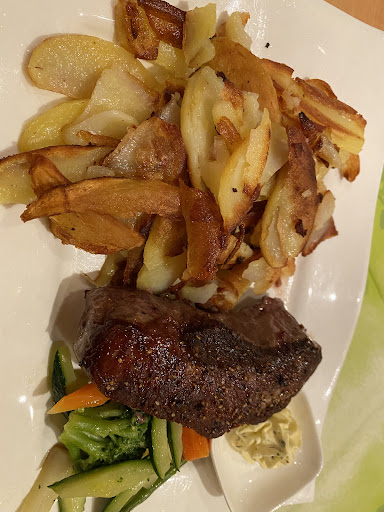 Dann hatten wir 2x den Jagdteller. Hirschbraten/Hirschrücken?! Leider und hier im Nachhinein tief enttäuschend. Es gab zwei sehr kleine Scheiben des Hirschbraten (dafür sehr viele Kroketten), und der arme Hirsch war TOD gebraten, ja meines Erachtens kurz vor einer Schuhsohle!!! . Meine "Vermutung", der Koch ist mit der Zeit der Vorsuppe (Vorspeise) durcheinander gekommen. Und das bei ZWEI (2) Tischen, von denen nur wir gegessen haben! . Schade. Vom Essen unter Mindeststandard ! . Toiletten nicht genutzt, Zugang sonst Behinderten freundlich. KEIN WiFi bzw. mit Passwort geschützt. . Besucht 06.Dezember 22, 2 Pers.