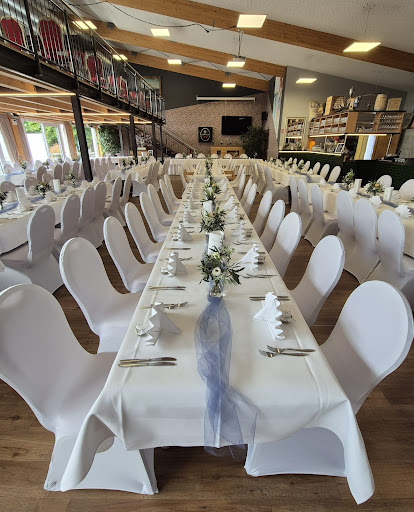 Besonders eindrucksvoll wirkt der Saal, wenn die Stühle mit weißen Stuhlhussen geschmückt sind. Die runden Lehnen der Stühle werden dadurch sanft umhüllt, was den gesamten Raum in eine stilvolle, edle Atmosphäre verwandelt. Die Hussen verleihen der Einrichtung ein harmonisches Gesamtbild und lassen selbst einfache Stühle wie elegante Bankettmöbel erscheinen.