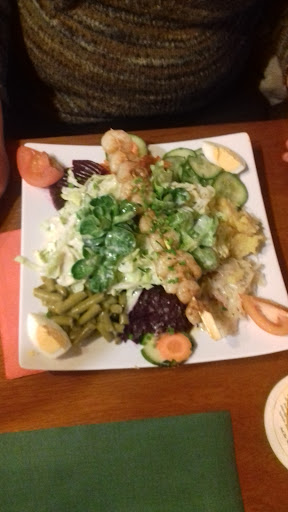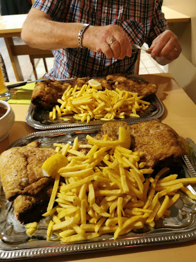 Ich kann von mir behaupten, dass ich große Schnitzel gerne Esse. Hier sind es aber so große Portionen, dass man nur vom Anschauen Würgreiz bekommt. Ich liebe Fleisch, aber sitze ich vor einem Teller, auf dem mein Schnitzel nochmals geknickt werden mußte, damit es überhaupt draufpasst, dann habe ich moralisch so ein schlechtes Gefühl, dass ich froh bin, dass solche XXL- Tempel aussterben. Der Bedienung haben wir offenbart, dass z. B. die Tütenspätzle gar nicht unser Fall sind. Sie meinte, dass Selbstgemachte natürlich besser wären...aber das würde man nicht auch noch hinbekommen... Naja....wenn ich die Schnitzel nicht mal halb so groß machen würde, stattdessen die Spätzle frisch, dann hat sich das kalkulatorisch auch gerechnet...und die Kunden haben sich nicht so an Schnitzel überfressen und kommen auch schneller wieder. Mal davon abgesehen: So günstig ist es hier nun auch nicht....wobei: von einem XLSchnitzel werden mal locker 2 stabile Männer satt...also wer schlau ist der teilt...hoffentlich tritt dann die Moral und Verantwortung wieder in die Küche und man plant nicht Portionen, die zu Dreiviertel in der Tonne landen. Die Salatsoße war gut....dafür gibt es einen Stern. Schnitzel nun ja bis ok....Pommes unterer Durchschnitt. ....schade das es so spät ist...ich würde gerne mein Gewissen erleichtern und die restlichen 1KG Fleisch dem...
