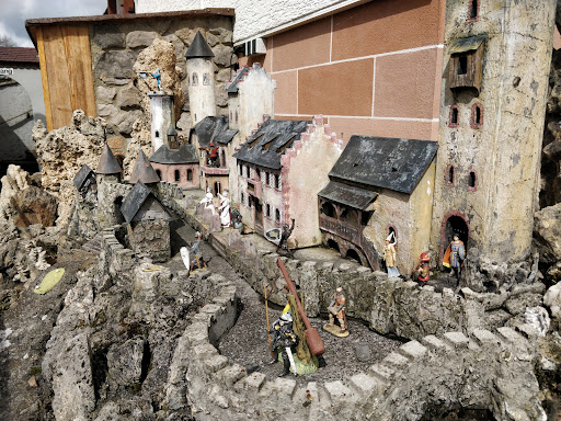 Schade! Ich hab mich sehr auf den Besuch gefreut, weil die Location echt toll aussieht. Das ist sie auch tatsächlich, nur müsste man leider umständlich einen Schlüssel extra anfordern um die Märchenwelt anzuschauen... Die Lage an der Straße stört so gut wie gar nicht. Zum Café: Wir kamen an und wurden durch den Kellner durch ein "oben" ziemlich apprupt in den oberen Bereich der Terrasse verwiesen. Leider wurden auch die weiteren Kontakte zu ihm nicht wirklich freundlicher. Das Essen und die Getränke wurden lieblos an die ihm zugewandte Tischseite gestellt, wir mussten es uns dort dann selbst wegholen. An den anderen Tischen ließ sich ähnliches Verhalten beobachten. So baten wir darum zu zahlen, er legte uns lieblos einige Minuten später den Beleg auf die Tischkante, und kam auch erst Minuten später wieder. Auch ist nur Barzahlung möglich. Zu seiner Entlastung sei zu sagen, dass er für eine sehr große Anzahl Tische allein zuständig war, es war keine zweite Servicekraft draußen. Jedoch erscheint es mir so, dass Freundlichkeit nicht unbedingt einer seiner Charakterzüge zu sein scheint. Die Speise an sich war auch enttäuschend. Für 12,40 Euro eine Käseplatte, da erwarte ich in einem üblichen (nicht Haute Cuisine) Café etwas besonderes. Schön angerichtet war es tatsächlich, aber es gab fast mehr Garnitur als Käse. Dieser Widerum war eher lapidar und langweilig. 2 Sorten gewöhnlichen, langweiligen Scheibenkäse und 3 Sorten Frischkäse, welchen ich als Lidl-Eigenmarke meine zu erkennen (zumindest bietet Lidl optisch und geschmacklich genau solchen Käse an) rechtfertigen den Preis in meinen Augen nicht. Es gibt kostenlose Parkplätze...
