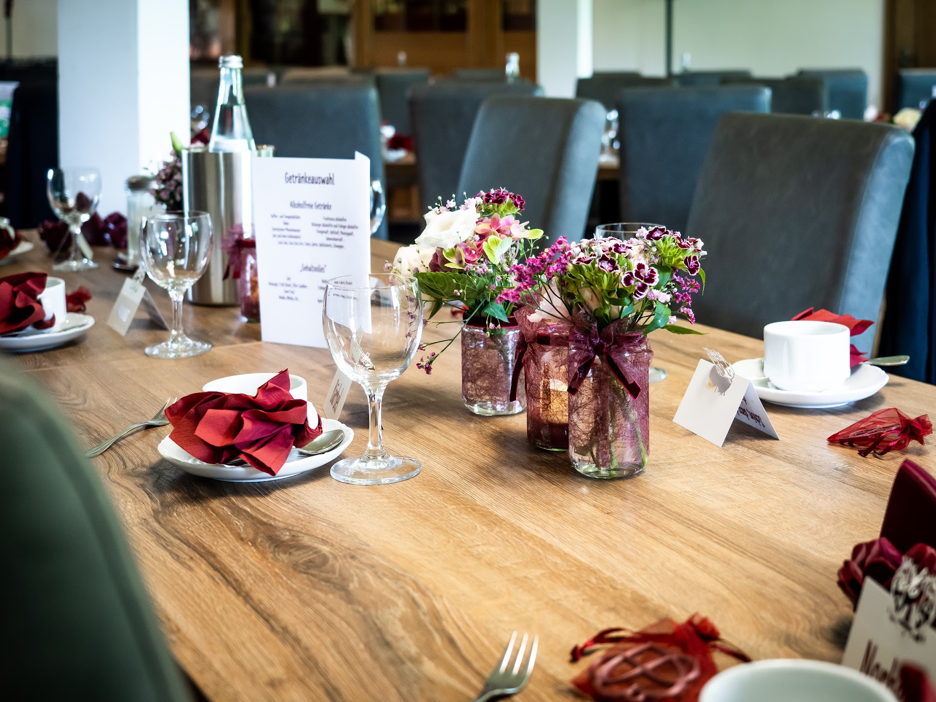 Die Location: Perfekt! Wir haben uns für den "Rittersaal" entschieden, welcher für insgesamt 42 Gäse eingedeckt wurde. Der Saal hat hierfür genau die richtige Größe. Sogar das Buffet konnte dort mit aufgebaut werden.