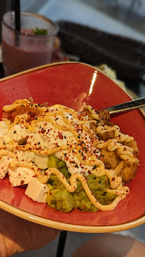 Waren nach dem Sport dort, eigentlich um lediglich einen Kaffee und / oder ein kaltes Getränk zu uns zu nehmen. Vorab: zum Zeitpunkt unseres Eintreffens, war das Café leer, lediglich die Tische außen waren belegt. Wir wurden freundlich begrüßt und konnten uns an einen Tisch unserer Wahl setzen. Natürlich ließ ich es mir nicht nehmen, mich wie King "T" in einen dieser hochlehnigen Sessel zu platzieren, um einerseits meiner Gegenüber, andererseits dem lustigen Treiben in der Eichhornstraße meine Aufmerksamkeit zu schenken. (Hier eine kleine persönliche Anmerkung meinerseits: natürlich ist es eines Königs angemessen, ihn in einem besonderen Licht zu präsentieren, aber sitzt man in dem gelben Sessel, des äußerst linken Platzes, bei den Fenstern, so sieht man nach kurzer Zeit nur noch Schatten, da man direkt angeleuchtet wird - also: Thron neu platzieren - aber überhaupt kein Problem, so konnte ich das Außentreiben noch weiter überblicken). Das Café macht einen sauberen, hygienischen Eindruck und lädt nach kurzem Studiums der Karte dazu ein, eines dieser doch vielversprechenden Kreationen, in Addition zu seinem Getränk, in sich aufnehmen zu wollen. Es ließt sich einfach auch zu gut, also nicht lange nachgedacht und unserer Wolllust nachgegeben und einmal "Superbowl" und einmal "All about Benedict" bestellt. Ging dann auch recht schnell und wir hatten erst unsere Getränke und kurze Zeit später auch unsere Mahlzeiten am kleinst-möglichen Tisch (was ja aber unsere Schulde war, vielmehr meine, denn es gibt durchaus richtige Tische in mehr als ausreichender Anzahl!!!). Gehen wir nun der Reihe nach durch: Kaffee - Americana: durchaus guter Kaffee, der jedoch mehr Bitterstoffe aufweist, als der Arabica, den ich privat verwende. Da dies jedoch eine Geschmackssache ist, kein Mangel, Geschmäcker sind ja durchaus verschieden. Auf jeden Fall guter Kaffee! Red Smoothie - rote Beeren: hier merkt man, dass der frisch zubereitet wurde. Schmeckt gut und ist nicht so künstlich süß wie in manch anderen Lokalitäten. Superbowl: die Zutaten schmackhaft und frisch und vom Geschmack her gut aufeinander abgestimmt. Einzig das Hühnchen war etwas trocken, was die Sauce leider auch nicht ändern konnte. Abhilfe hat hier mein großer Mundraum geschaffen, in dem sich sämtliche Texturen gut vermischen ließen, was, durch Beihilfe meines Mahlwerks, letztlich zu einer or645mi5ch3n Geschmacksexplosion geführt hat. Auch die Tatsache, dass man Pochierte Eier bekommt, erzeugt einfach nur einen Pluspunkt. Gewünscht hätte ich mir, dass der Chili ein wenig mehr kickt, steht auf der Karte der kleine Vermerk "Hot". Auch hier ist mir bewusst, dass das "Hot" des einen, nicht das "Hot" des anderen (m/w/d) ist, aber ich wage zu behaupen, dass ein "Spicy" oder "Pikant" hier gereicht hätten - Jammern auf hohem Niveau, ich weiß. All about Benedict: super lecker. Mehr muss man hier nicht sagen. Gibt nichts zu bemängeln oder zu meckern.