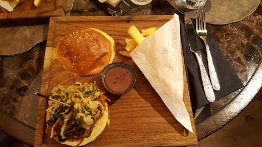 Nun zu meiner Erfahrung, etwas ausführlicher. Wir wurden von einer freundlichen Dame in den Innenbereich geführt und konnten uns unseren Platz aussuchen. Wir entschieden uns für eine der runden Sitzgelegenheiten mit bis zu 4 Plätzen, schließlich war genug Platz da und kaum Gäste :-) . Der Innenbereich ist dunkel gehalten, mit gemütlichem Licht und ergibt einen coolen und nobleren Flair. Als wir dann die Karten bekamen, musste ich diese aber erst Mal sortieren, um mir einen Überblick zu verschaffen. Es gibt eine große Karte mit Speisen, eine kleine für Desserts, eine Wochen- oder Wochenendkarte und eine kleine Getränkebroschüre - das Ganze natürlich Mal 2, weil 2 Personen. Wir nahmen die Vorspeise BBQ Chicken-Wings einmal zu zweit, welche auch prompt an den Tisch gebracht wurde und ultra lecker war. Die Hauptspeise, einmal ein Bacon Cheese Burger und ein Pulled Pork Burger, haben aber etwa 45 Minuten auf sich warten lassen. Das war für uns nicht weiter schlimm, denn immerhin hatten wir gerade schon eine kleine Vorspeise. Die Burger waren übrigens wirklich sehr lecker. Die angebratenen Brötchen waren was Besonderes und sicher selbstgemacht oder mindestens vom professionellen Bäcker, das Fleisch war super saftig, die Garstufe des Bacon Burgers war leider nicht 100%ig getroffen, aber dennoch Ok. Gemüse wie Salat, Kraut oder Karotten waren frisch und lecker. Die BBQ Soße auf beiden Burgern war der Oberhammer und passte einfach perfekt. Zu den Getränken möchte ich erwähnen, dass ich mir eine sehr leckere hausgemachte Limetten-Limonade bestellt habe, die ich an dieser Stelle nur wärmstens empfehlen kann, obgleich ich dazu sagen muss, dass es sehr (für mich super angenehm und erfrischend) sauer war. Anschließend haben wir uns noch ein Dessert geteilt. Ein Cheesecake Cream Erdbeer Crumble, und ich hätte mich reinlegen können, so lecker war das. Danke Beef 800° für dieses Dessert. Für also 2x Cola, 1x 0.75L Wasser, 1x Limetten-Limonade, 1x Bacon Cheese Burger, 1x Pulled Pork Burger und 1x Cheesecake Dessert habe ich etwa 52€ gezahlt. Die Zahlung konnte ich inklusive Trinkgeld mit Karte tätigen. Das Preis/Leistung ist, finde ich, wirklich Ok. Manches kostet vielleicht mehr als gewöhnlich, aber dafür esse ich im Beef 800° auch besser als gewöhnlich.