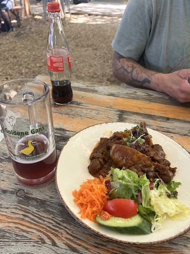 Read moreDie ‚Goldene Gans‘ macht ihren Namen mal alle Ehre! Soviel Biergärten Nähe der Alten Mainbrücke gibt es nicht. Somit bietet der Biergarten nicht nur einen super Ausblick auf das Mainufer, auch das Treiben an der Schleuse und auf dem Main kann bestaunt werden. Der Garten ist durch Sonnenschirme flächendeckend beschattet, deshalb ist es hier auch bei über 30 Grad möglich lange zu verweilen, Kraft zu tanken. Anstatt Kies befindet sich hier Rindenmulch am Boden. Dies ist nicht nur staubfreier, sondern viel angenehmeres Gefühl beim gehen. Bierbankgarnituren inklusive Rückenlehne. Für die Kleinsten gibt es ein Riesentrampolin, sowie einen Sandkasten. Das hier der Gast ganz ganz wichtig ist merkt man auch beim Empfang durch das Personal am Eingang. Freundlich & Zuvorkommend, Hilfe bei der Platzwahl. Die Traditionelle Tracht, gestaltet in weiß/grün, runden für mein Auge den Garten perfekt ab. Sonntags vor Abreise mussten es unbedingt noch fränkische Bratwürste mit Kartoffelsalat sein. Super gebraten waren die Würste, die Dunkelbiersoße könnte meiner Meinung nach weltweit das Ketchup zu den Würsten ersetzen (& Senf), der Kartoffelsalat war in jedem Aspekt perfekt! Das eigene, naturtrübe Bier war einfach nur herrlich im Geschmack! Schön süffig, kein herbes Bier, passt mit bestimmt zu jedem angebotenen Mahl aus dieser Küche. War ein spontaner Besuch vor Abreise, schade das ich nicht noch mehr Zeit hatte. Immer wieder...