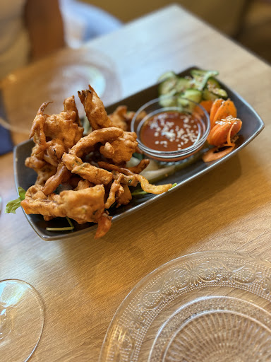 Die Vorspeise (Hühnchen und Gemüse im Kirchererbsenteig) mit einer Sweet-Chili-Sauce war sehr lecker und machte Vorfreude auf die Hauptgerichte.