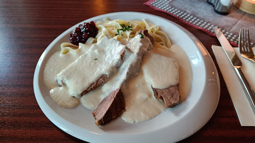 Read moreWaren heute zum ersten mal hier und sind wirklich positiv, überrascht. Das Lokal machte einen sehr sauberen Eindruck und war gut besucht. Die Einrichtung ist in einem sehr ansprechenden Mix aus Rustikal und Modern gehalten. Kostenloses Parken war dank des großen Parkplatzes direkt vor der Tür kein Problem. Wir wurden beim hereinkommen freundlich begrüßt und bekamen schnell die Getränke unserer Wahl, die kompetente Weinberatung und natürlich auch den sehr guten Wein möchten wir hier ein extra Lob aussprechen! Als Vorspeise wählten wir zwei Sauerkraut-Cremesüppchen die wirklich vorzüglich waren. Im Hauptgang entschieden wir uns für die Rinderroulade mit Blaukraut und Kartoffelklößen, sowie einen schönen fränkischen Sauerbraten ebenfalls mit Blaukraut und Klößen. Das Blaukraut war sichtlich hausgemacht und die Roulade einfach riesig und lecker, der Sauerbraten hatte ebenso eine umwerfende Fleischqualität und uns wurde auf Nachfrage gesagt das er mindestens 7 Tage selbst eingelegt wird. Als Desert teilten wir uns ein Dominosteinparfait mit flambierten Früchten, da nichts mehr reingepasst hätte, eine wirklich witzige und leckere Idee. Uns hat es hier wirklich ausgesprochen gut gefallen und wir kommen zu 100 % wieder!!! Die 5 Sterne sind für das was beworben und dem was geliefert wird absolut verdient. Weiter so...