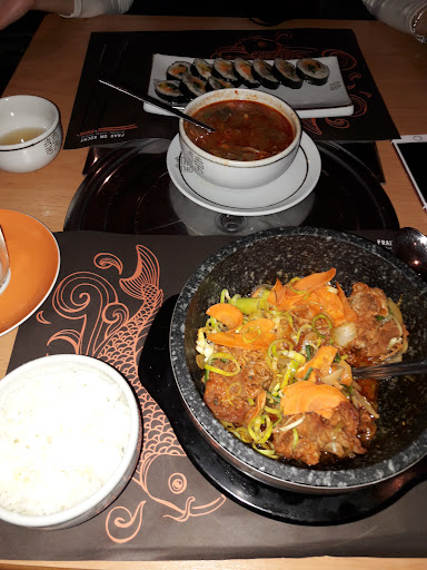 Service was very courteous, friendly and prompt. Five tables (out of eight or so) were occupied in the main section during our lunch, and one server took care of it all with very efficiency. Our drinks and food orders were taken right away, and our food came out of the kitchen fairly fast. Lunch Bibimbap (8,50€) was reasonable and tasty. I thought we might get some banchan (side dishes), but we didn't. That was somewhat disappointing. Judging from what was on our bibimbap, they have decent banchan. I also thought the portion of rice was somewhat small, so it didn't give me a sense of overwhelming fullness after finishing the whole bowl. Well, don't bother with their "mild" sauce and stick to the traditional gotchjan instead. It had certain sour taste to it and wasn't too good IMHO. It left a funny aftertaste in my mouth. It had an option of vegan, so I think it perhaps reflected the university population in Würzburg.