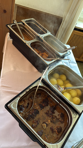 Read moreDas Gasthaus liegt so ziemlich Ortsmittig. Parkplätze am Gebäude sind sehr eng bemessen aber auf den umliegenden Straßen geht es auch. Direkt gegenüber eine Kirche. Der Glockenklang ist schön aber manchmal will man einfach seine Ruhe haben. Mein Zimmer, ausreichend groß, schick und gemütlich eingerichtet. Für den Sommer finde ich das Bettzeug zu dick. Gelegen hat sich das Bett gut. Die Dusche relativ eng. Bad soweit in Ordnung aber hier und da kann es sauberer sein. Kein Fahrstuhl, das Haus ist an vielen Stellen noch Original wie im 18ten Jahrhundert, so auch ein Teil des Restaurants. Das Hotel ansich, ist sehr gemütlich, schick. Eben ein Gasthaus. Nebenan gleich der hauseigene Fleischer, sogar eine Brennerei gibt es hier. Zum Frühstück gibt es aus der eigenen Fleischerei die Wurst. Sehr lecker. Das Frühstücksbuffet ist nicht so umfangreich wie man es erwartet. Obst ja, Gemüsen nein. Kein Joghurt und auch sonst alles auf einem Tisch, eng bemessen. Brötchen frisch und lecker, Kaffee spitze. Eierspeisen werden auf Wusch bereitet. Im selben Raum, abends das Restaurant. Das Essen ist täglich abwechslungsreich und es schmeckt....