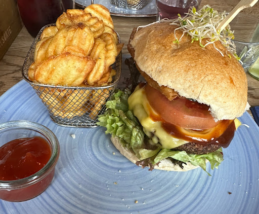 Read moreThe cosiest vegan restaurant we've been to. Friendly staff and so many options on the menu! We tried the burgers; I had "Der Afrikaner" with the tomato bun. It was delicious but very mushy and wet, didn't really hold together as a burger but I appreciated the option to stray away from the normal bread bun. The vegan cheese and mayo was incredible, making me question if I actually liked it because it was so much like the non-vegan kind. The sweet potato fries were also so crispy and perfect. My boyfriend's burger "Der Mexikaner" held together very well in the bread bun, was flavourful and had a good texture that wasn't too meaty which we liked. The drinks were a bit expensive, although the cappuccino with soya milk was the best we'd had since going vegan 2 years ago. Overall a lovely place to have discovered and go to now and again but too expensive for us to...