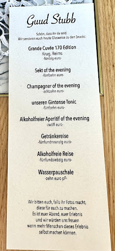 Wir entschieden uns für die Basis-Variante in 15 Gängen ohne korrespondierender Begleitung, da wir beide gerne flaschenweise bestellen, um somit auch mal leicht gereifte Schätze aus aller Welt probieren zu können.