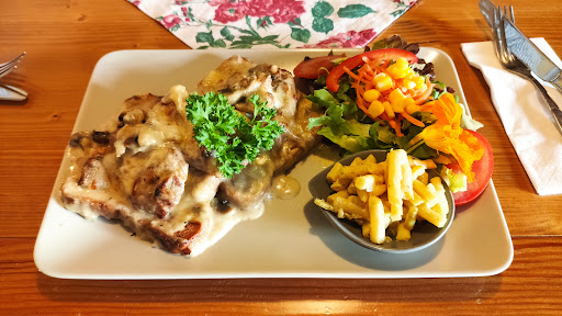 Super leckeres Essen. Ausgefallenere Kombinationen aber auch gute deutsche Küche. Sehr zu empfehlen. Auch das toll gestaltete urige Ambiente lädt zum Verweilen ein. Jeder Tisch hat andere Stühle oder auch mal ein Sofa. Auf dem Foto der Beilagensalat und Mama's Lieblingstoast mit Schweinefilet überbacken mit Käse auf Toast.