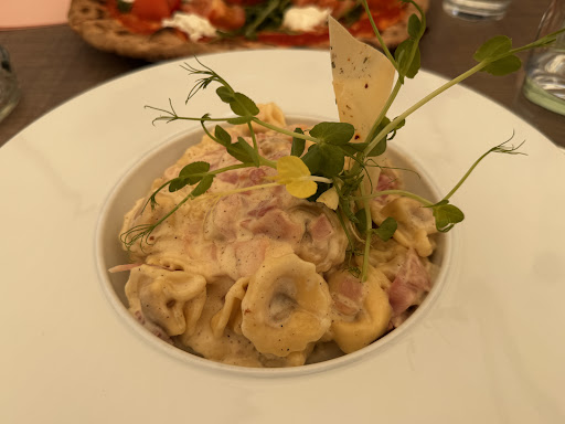 Ich hatte vorab von mehr als 10 Restaurants die Speisekarten angeschaut und mich daraufhin für dieses entschieden da es sehr ausgefallene Gericht (und auch vegetarische!) auf der Mittagskarte hatte. Die Enttäuschung warum umso größer als wir erfahren haben, dass die Mittagskarte die online einzusehen ist schon veraltet ist und keines der Gerichte verfügbar war. Statt Hausgemachte Linguini in einer Maronen-Austerpilze-Salsa, verfeinert mitZucchini Zoodles & Brombeeren für 12€ habe ich dann einfach nur Tortellini mit Schinken für 15,-€ gegessen. Meine Mutter ist Vegetarierin. Für sie gab es gar nicht auf der Mittagskarte. Sie musste dann wohl oder übel Pizza essen. Das ist super ärgerlich wenn man extra wegen der ausgefallenen Karate das Restaurant ausgewählt hat. Der Chef hat sich im Nachhinein entschuldigt, das hat uns aber nichts gebracht da die Bedingung die unsere Bestellung aufgenommen hat leider keine vegetarische Variante anbieten konnte. Für den Ärger gab es auch lediglich eine Entschuldigung, aber keinen Espresso oder eine andere Wiedergutmachung. Das Wasser wurde ausschließlich in bereits geöffneten Wasserflaschen serviert. Diese waren mit einem schicken Glasverschluß verschlossen, aber ehrlich gesagt, hätte genauso gut Leitungswasser drin sein können. Ich erwarte eigentlich eine verschlossene Flasche zu erhalten. Die Qualität der servierten Speisen war durchschnittlich und lange nicht das was ich erwartet habe. Die Pizza war am Rand nicht so schön aufgegangen wie auf den anderen Fotos die im Internet zu sehen sind und die Tortellini mit Schinken war außer der Dekoration leider nicht wirklich raffiniert. Ich habe mir hier wirklich etwas anderes erwartet und vergebe noch wohlwollende 3 Sterne. Eigentlich habe ich mich an diesem Tag...