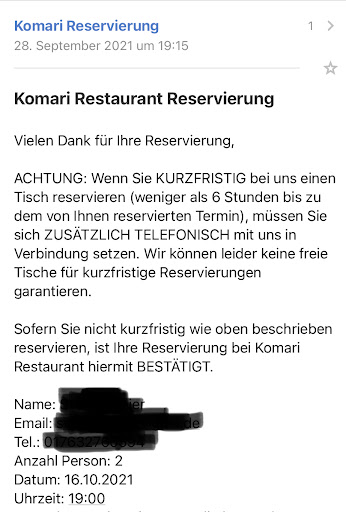 Read moreSelten so schlecht behandelt worden! Ich habe bereits am 28.09.2021, für 2 Personen, am 16.10.2021 reserviert und auch eine Bestätigungsmail erhalten. In der Mail stand, dass man bei kurzfristigen Reservierungen, unter 6 Stunden sicherheitshalber nochmal anrufen solle, um sich die Reservierung bestätigen zu lassen. Brauchte ich ja nicht da ich bereits weit im Vorfeld reserviert hatte (siehe Foto). Also machte ich mir den weiten Weg extra nach Waiblingen, um ins „tolle“ Komari zu gehen. Am Eingang wurde ich von der weiblichen Servicekraft nach Namen und Reservierungsuhrzeit gefragt-konnte sie aber nicht in den Büchern finden. Im gleichen Augenblick kam eine männliche Servicekraft dazu die mich barsch fragte wann ich reserviert hätte und ob ich auch mal in mein Handy schauen würde. Man hätte mehrfach versucht mich zu erreichen.-Lüge for life! Ich habe mein Handy aus beruflichen Gründen immer zur Hand und dieses Restaurant hat mich niemals angerufen! Danach wurde mir aufgetischt, dass ich die Mail hätte beachten sollen, die beinhalten solle, dass man sich selbst nochmal melden muss, auch wenn man online reserviert hat-Schon klar, aber nur wenn der Zeitraum kurzfristig ist. Aber kann sein dass der Herr ja mit einer Reservierung aus dem Jahr 2020 glücklicher gewesen wäre.. Ergo: Es wurde nur im Kreis geredet um mich endlich los zu werden. Die tollen Leute vom Service haben wahrscheinlich eher die Plätze an Laufkundschaft vergeben und haben vergessen einen Platz frei zu halten, weil die Reservierung aus dem Vormonat stammt. Lange Rede gar kein Sinn-bevor ich dem aufmüpfigen Herrn eine verbale Ohrfeige verpassen wollte, bin ich ins Mikoto nach Stuttgart gegangen, wo man noch ernsthaft daran interessiert ist „gastfreundlich“ zu sein. Das Komari sieht mich nie wieder und schult lieber mal seine Leute bei einer IHK anstatt einen auf Social Media...